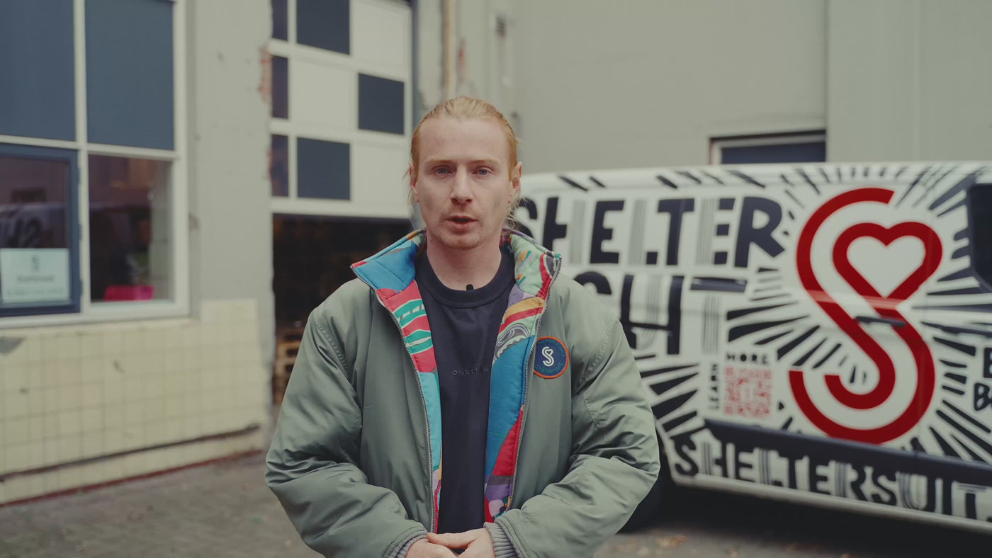 Bij Sheltersuit Foundation geloven zij dat iedereen recht heeft op warmte, bescherming en waardigheid. Sinds 2014 ontwerpen en produceren zij multifunctionele producten die direct onderdak bieden aan mensen die dakloos zijn. De iconische Sheltersuit, een water- en winddichte jas die kan worden omgevormd tot een slaapzak, wordt gemaakt van upcycled materialen en met de hand vervaardigd in sociale werkplaatsen. Daarmee bieden zij niet alleen bescherming aan de meest kwetsbaren, maar creëren zij ook werkgelegenheid voor mensen met een afstand tot de arbeidsmarkt.
